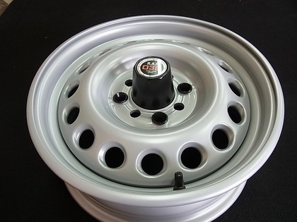 パウダーコートカラーサンプル画像【マットシルバー】 パウダーコートマットシルバー一概に「シルバー」といっても本当に沢山の種類があります。このシルバーは、マットタイプになります。 マットと言っても全艶消しというほどではなく、ハーフグロス(半艶)ほどのイメージになります。グロス(艶有り)と比べると、やや無骨な雰囲気がありますね。車ホイール塗装イメージ