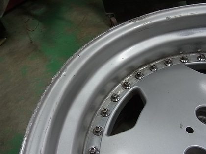 以前に修理された他店のショップさんが書いたであろう側面の落書き、こういった物を良く見かけますが、お客様のホイールに直接マジックで書き、そのまま納品するレベルなので、きちんと修理されているはずもなく、アウターリムはシルバーに塗装されておりますし、歪みも修正し切れておらず、曲がり部分にはパテを入れて帳尻を合わせておりました。