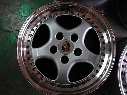 ポルシェスピードラインホイール(レプリカ)フルオーバーホール修理 2014年9月3日 ポルシェスピードラインのレプリカです経年での白サビなどありますので、フルO/H修理です本当は3ピースですが、これは1ピースですね丸ごと剥離し、ブラスト研磨からバレル粗研磨ですパウダーコートポルシェシルバー噴射ポルシェシルバーで一旦完成アウターリムをバフポリッシュ加工パウダーコートクリアー丸塗りピアスボルトはダミーの樹脂製でしたので、ネジを切り、ステンレスキャップスクリューに交換します1本に付き40、4本で160、手切りです・・・完成です