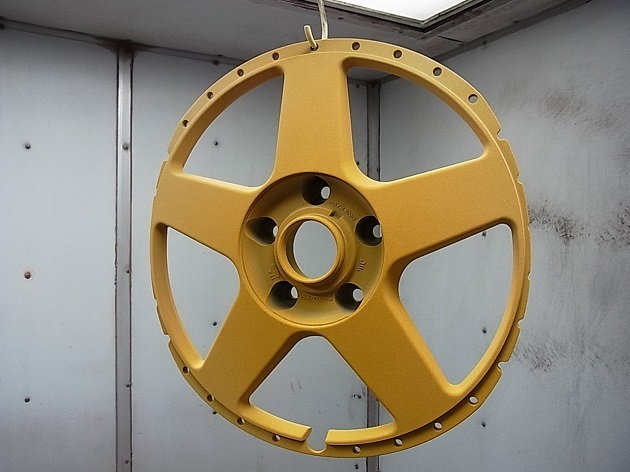 焼付けてグロスブラックを硬化させ、アウターリムをポリッシュ磨き、最後にパウダーコートクリアーを丸塗りです。