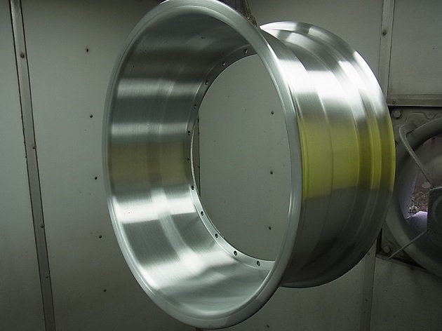 一旦焼き付けしグレーで完成後に、アウターリムをポリッシュ加工をします。ポリッシュは回転研磨後にバフ磨きでポリッシュにし、さらにバレル仕上げ研磨にかけ、バフ目やムラの無い綺麗な鏡面にします。
