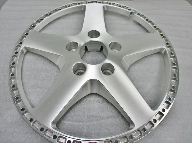 ディスクの塗装を剥離、equipは素地の砂目が結構粗いので、アクション研磨からバレル粗研磨+バレル仕上げ研磨にかけて、素地の砂肌をある程度消し、尚且つなんとなくポリッシュ気味にまで下処理をしてから、スポーク間もブラッシュドの3Dブラッシュド加工です。