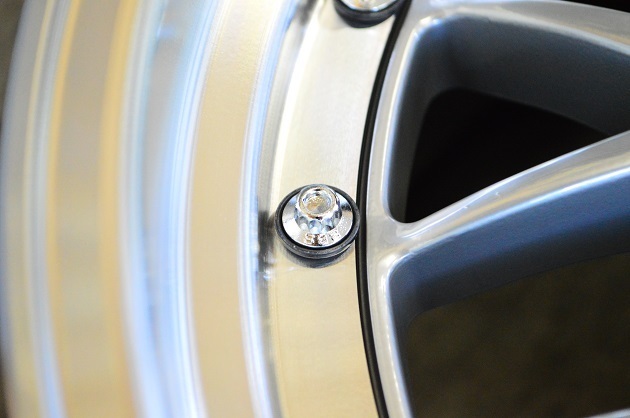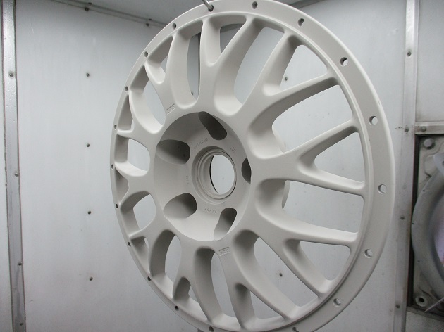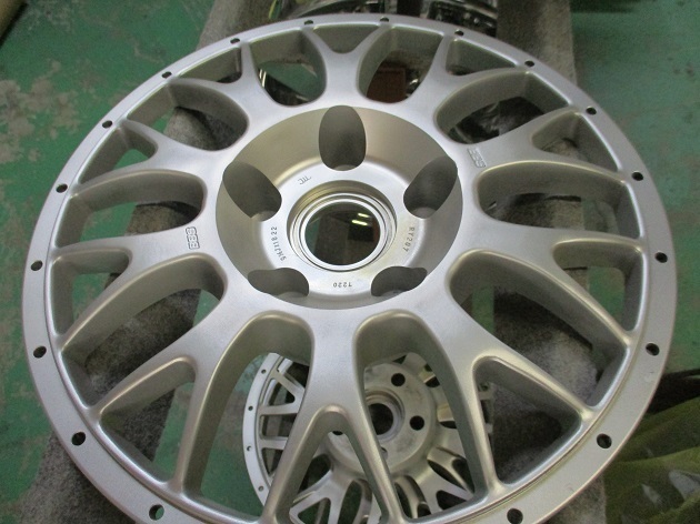 回転研磨で塗装剥離と下地を整え、ハーフグロスブラックをパウダーコートし、焼き付けハーフグロスブラック完成後に、アウターリムをダイヤモンドカット加工、BBSとMAGNESIUM FORGEDのロゴを製作&貼り付け、最後にウレタンクリアーで閉じます。