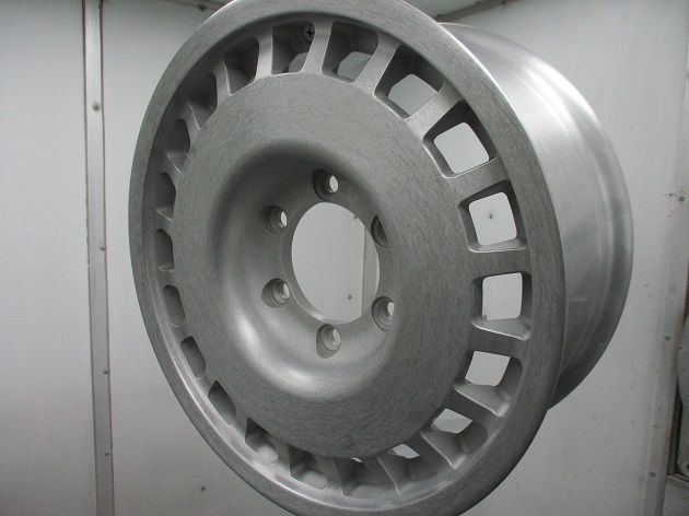 前回の作業内容は、ベース(赤)は通常通りにパウダーコートで塗装をし、OZラリーはディスク面の大きなロゴがありますので、ロゴをカッティングで製作貼り付け、ステッカー剥がれ防止の目的で溶剤ウレタンクリアーで閉じました。溶剤ウレタン塗装はパウダーコートに比べると格段に弱いので、本来はあまり使いたくありませんが、ステッカーを埋める必要のある場合は、ステッカーはパウダーコートの焼温度180度オーバーには当然耐えられませんので、どうしても溶剤ウレタン塗装を使うしかありません。