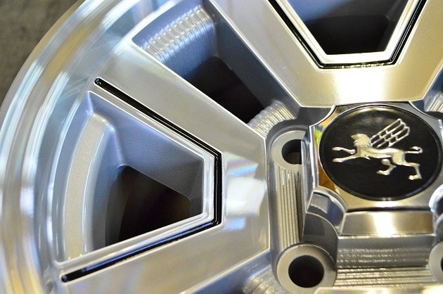 元々の塗装を剥離→ブラスト研磨→バレル粗研磨→ウインドウ&インナーのシルバー塗装→スポーク天面溝のブラック塗装→表面全面ダイヤモンドカット→クリアー塗装、と言う工程になります。