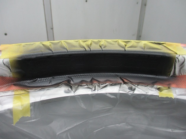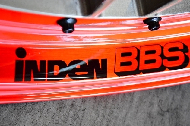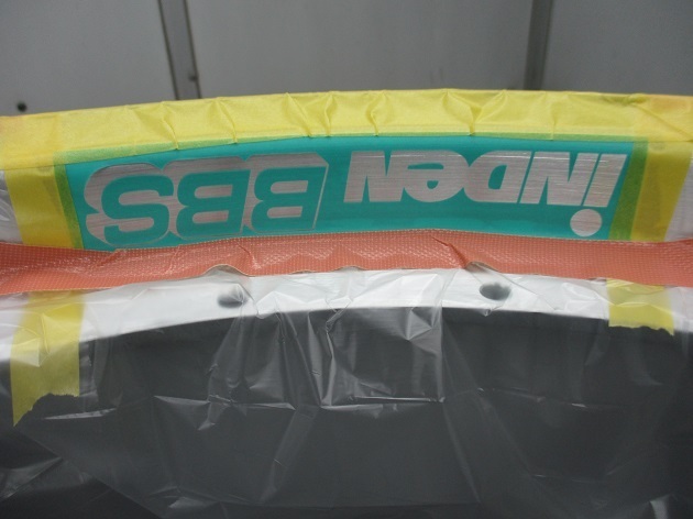 今回はアウターにINDEN BBSのロゴを入れます。当初はサンドブラストで素地に傷を付ける『エッヂング』加工でロゴを入れる予定でしたが、エッヂングは素地が多少曇る程度ですので、クリアーフィニッシュであれば効果的ですが、色合いの濃いキャンディーを乗せるとほとんどわからなくなってしまいます。そのため塗装(黒)で入れる事にしました。塗装ロゴの上にパウダーコートが乗るので、普通のウレタン塗装ではパウダーコートの焼き温度200℃には耐えられないため、高温でもOKなガンコートを使います。