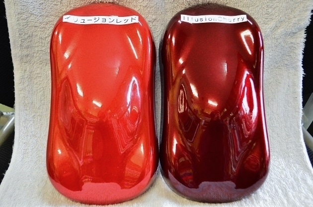 パウダーコートカラーサンプル画像【イリュージョンレッド】 2018年5月12日 パウダーコートイリュージョンレッド鮮やかで濃厚な微粒子メタリックのレッドです。塗装方法はキャンディーとは違い普通のメタリック塗装と同じ方法ですが、仕上がりはキャンディーの風合いで仕上がる、正にイリュージョンなカラーです。以下画像は同じイリュージョン系カラーのイリュージョンチェリーとの比較画像です。純粋な赤のイリュージョンレッドに比べ、イリュージョンチェリーの方はワインのような色合いになりかなり濃い目なのが分かります。ホイール塗装イメージ