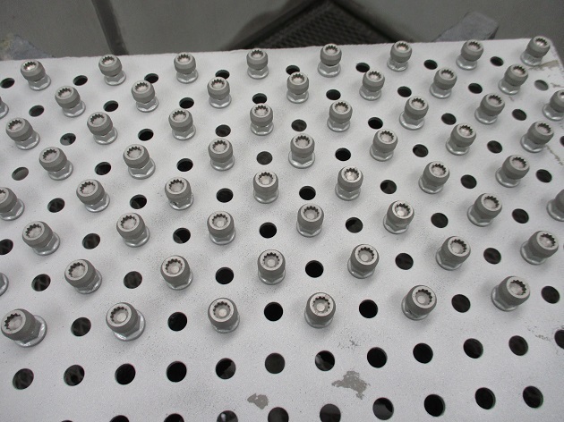 ピアスボルトの塗装もホイール同様にパウダーコートでも良いのですが、パウダーコートは塗膜がぶ厚いので、今回のようなギザギザの内溝タイプのピアスボルトの場合は、工具がキツクなり、傷が付いてしまう事もありますので、塗膜が非常に薄いにも関わらず、密着性、塗膜強度が高いガンコートでの塗装にします。