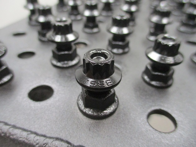 ピアスボルトの塗装もパウダーコートでも良いのですが、パウダーコートは塗膜が厚いので、頭のギザギザやBBSの刻印がボヤットしますので、当社では塗膜が薄くても強靭な塗装のガンコートでの塗装にします。