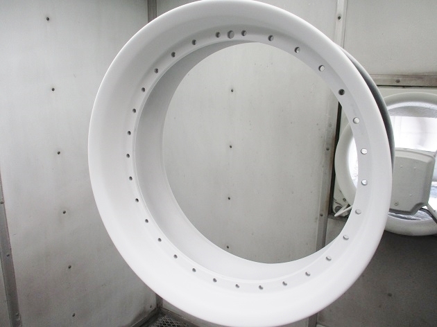 インナーリムのグロスブラックを焼き付けて硬化させ、アウターリムの磨き→バフ磨きでポリッシュにします。普通はこれでポリッシュとして完成ですが、当社ではここからさらにバレル仕上げ研磨にかけ、バフ目や光沢ムラのない綺麗な鏡面にまでもっていきます。