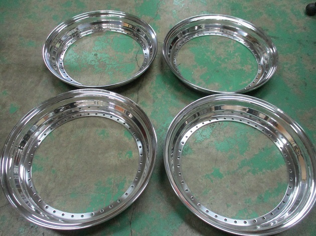 アウターリムはバフ磨きの状態で届きますが、バフ目やムラがありますんので、自社にてバレル仕上げ研磨にかけ、バフ目やムラの無い鏡面ポリッシュにしてからパウダーコートクリアー塗装です。