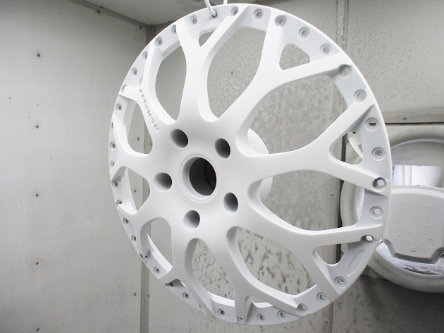 途中画像がありませんが、元の塗装を剥離、ブラスト研磨からバレル粗研磨にかけ、塗装の下地を作り、まずはグロスブラックをパウダーコートします。