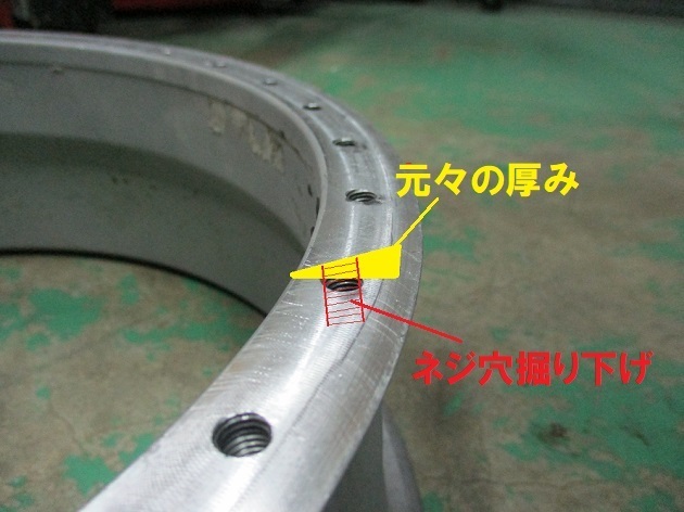 ネジ穴掘り下げと言っても、アウター側カットと同時に斜めを水平にする必要もあったため、その分厚みは薄くなり、余裕のある程の厚みはなく、ピアスボルトが最低限噛むであろうギリギリの厚みしかありません。