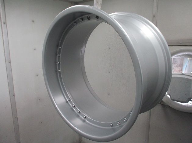 焼付けてシルバー硬化後に、今度はクリアーをオーバーコートし、さらにもう一度焼き付けてリムのシルバ^塗装仕上げで完成です。