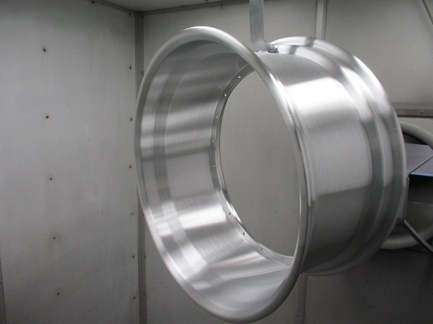 アウター側は、オリジナルは旋盤ポリッシュのダイヤモンドカットで、もちろんダイヤモンドカット仕上げは可能ですが、ダイヤモンドカット仕上げの場合のクリアー塗装は、溶剤ウレタン塗装になり、パウダーコートクリアーに比べると塗装の強度は劣るので、回転研磨で疑似ラインを残したダイヤモンドカット似仕上げにし、クリアーは丈夫なパウダーコートにする仕様が多いですが、今回はクリアーの耐久性よりも、ズバリダイヤモンドカット優先と言う事で、オリジナル同様にダイヤモンドカット+溶剤クリアー塗装にします。