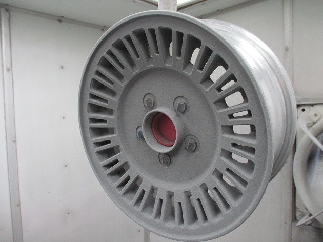 先にスポーク間の塗装を済ませますので、元の色合いと近似のガンメタをパウダーコートします。