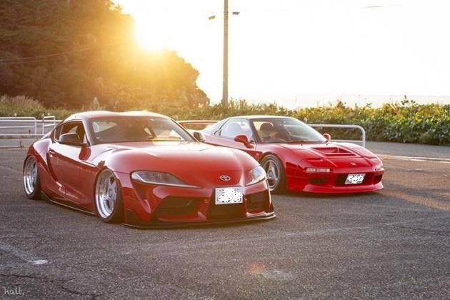 一緒に写っているトヨタトヨタ90スープラが履いているOZフッツーラも、記録記事はありませんが、以前に当社で18→19のダブルステップリムにリム交換リバレル加工をさせていただいたホイールです。