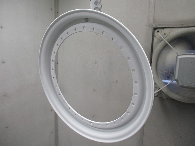 リムはアウターもインナーもグロスブラック塗装なので、元の塗装を剥離し、回転研磨で素地を整えてからグロスブラックをパウダーコートします。