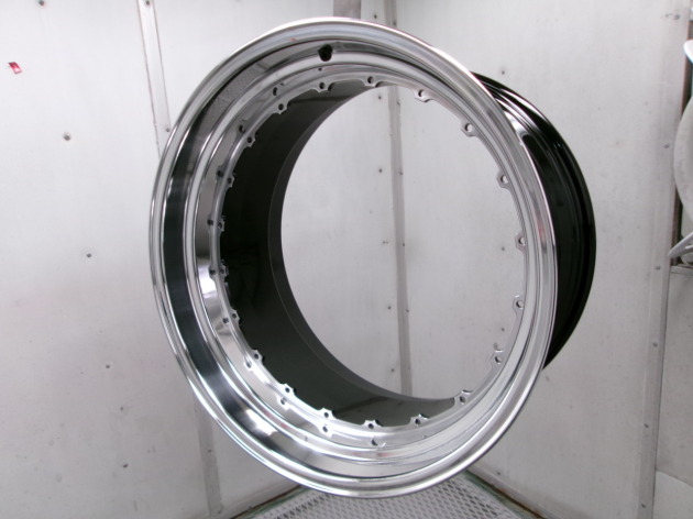 インナーリムはブラックご希望ですので、元の塗装を剥離し、回転研磨で素地を整えてから、ブラックをパウダーコートします。