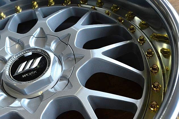 現在のワークホイールは、3Pと謡われていてもアウターリムとインナーリムが溶接されている実質2P構造だったり、2Pと謡われていても、ダミーピアス付きのディスク溶接で実質1P構造だったりがほとんどですが、この当時のワークは、このVS-Editionはじめ、E-Wing、レイバー等々、本当の3Pとして組まれている物が多く、あくまで個人的なイメージですが、この当時の作りの方がホイールらしいと言いますか、王道の感じがします。