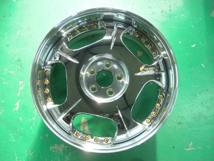 ロデオドライブ キャバリィ リム曲がり修理 2010年12月17日 ロデオドライブ キャバリィですリムの曲がりの修理です光輝アルマイトリムの修理後の仕上げは本来は再アルマイト加工が必要ですですが、再アルマイト加工はクロームメッキ加工に次ぎ高額になるためほとんどの場合は、鏡面ポリッシュ仕上げで光輝アルマイトの肌に似せる仕上げにします