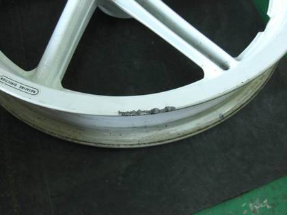 2輪NSR純正マグネシウムホイールのリム削れ修理/塗装 2008年7月5日 2輪のNSR純正マグネシウムホイールの塗装です当店では2輪のホイールは基本的には作業しませんがましてやマグネシウムホイールという・・・ただ今回は、修正内容がリム一部分の削れと全塗装ということでしたのでそれならOK!ということで作業です削れ具合もほんの一部分です大分色焼けしていましたので、もともとのホワイトに全塗装仕上げです2輪のホイールは、表裏が無くどちらも表?なので結構手間がかかります