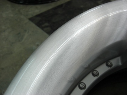 まずはリムとディスクをばらし、リムのパウダーコート下処理で研磨します