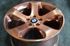 大阪府からのご依頼です。 BMWアルピナビターボ用鍛造ホイール、ブラッシュドカスタム済で、今回はイメチェンで色使いを変えます。 塗装剥離から塗装&ブラッシュド加工後にキャンディー塗装です まずは塗装を
