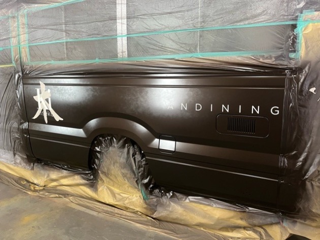木ニセコさまのトヨタコースター 1番の難関!ロゴペイントスタート♪ 2023年11月15日 お預かり中の木ニセコさまのトヨタコースター全塗装。ロゴペイントの下準備をして次のパネルの塗装へ途中で撮影する余裕がなくメインのブラウンを塗装後にロゴのマスキングを剥がしてまたクリアで一旦閉じます。これで完成ではなく更に2種類ロゴマークを塗装するのでまたまた乾燥させて次の工程へ。今回の1番の山場は越えたので少し安心しました♪
