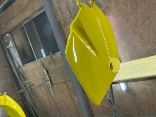 スズキDRZ450 外装リフレッシュペイントのご依頼です♪ 2024年5月14日 お預かり中のスズキDRZ450の外装パーツリフレッシュタンクの塗装が完了したので残りのフェンダーとゼッケンプレートを下地を作って塗装していきます。フライングで下色の白塗ってますがタンクは黄色から黒でしたがこちらの2点は黒から黄色スズキイエロー?かな?乾燥したらサラッと磨いて完成。イメチェン完了です♪ご依頼ありがとうございました♪
