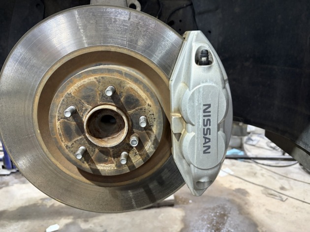 交換前はノーマルカラーのキャリパーとブレーキローターが付いています。