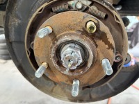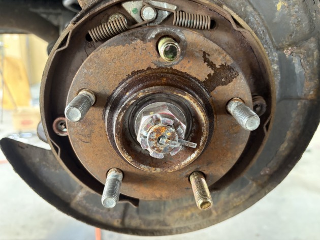 ブレーキキャリパー・ローターを取り外し、ハンマーで破損したハブボルトを抜きました。