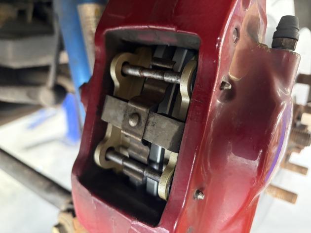 フロント同様に新品のディクセル製ブレーキディスクローターを取り付け、ブレーキキャリパーを付けてブレーキパッドを組み付けます。