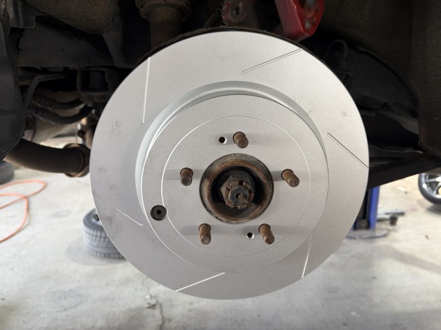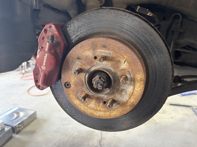 新品のディクセル製ブレーキディスクローターを取り付け、ブレーキキャリパーを付けてブレーキパッドを組み付けます。