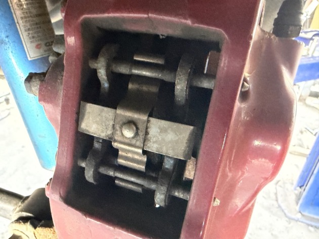 交換前のリア側は、ブレーキパッドは残量はあるものの劣化によりボロボロになってます。