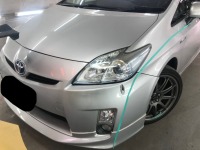 接触事故修理依頼で30プリウス入庫です 狭い路地での接触事故 フロントバンパーの角からリアドアにかけて傷凹みと比較的軽度な損傷 保険適応となりますのでまずは打ち合わせしながらバラし作業を進めていきます
