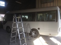 200系ハイエースのオールペイント&看板ロゴペイントの仕上がりにお喜び頂き もう1台の送迎車コースターのオールペンもオーダーいただきました。 トヨタコースターど新車で納車後まっすぐ入庫頂きました。 基