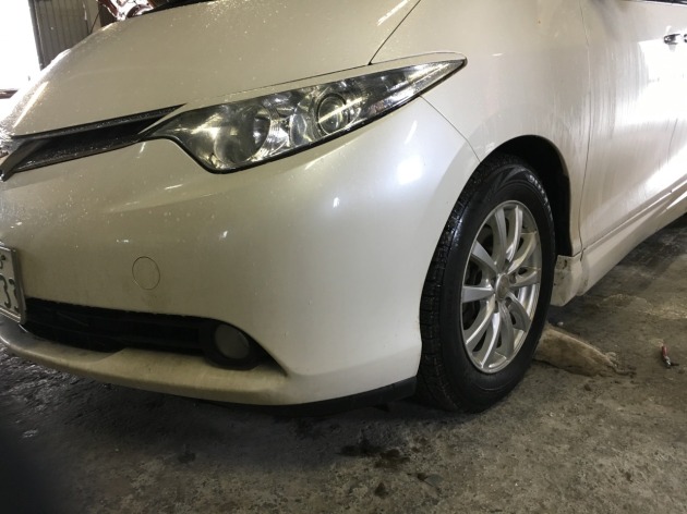 フロント足回りからの異音点検ご依頼でトヨタエスティマが入庫しました。 また、異音点検ご依頼の他に『(こちらのエスティマに装着している)フロントリップスポイラーの左角辺りについているガリ傷を部分的にで良