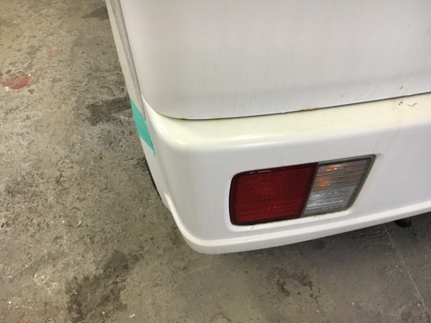 オレンジ系カスタムカラーで全塗装されたスズキエブリイバンが、接触事故修理ご依頼で入庫です。 今回の修理内容は「リアバンパーの新品交換」と「リアフェンダーの板金塗装」になります。 まずは、、、交換用の新