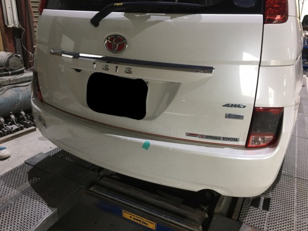 バックで雪壁にぶつけてリア周りが凹んでしまったトヨタアイシスが入庫です 車両保険加入の為全て保険で修理対応できます。 リヤゲートとリヤバンパーがベコリと ガーニッシュも折れてしまってるので全部交換しま