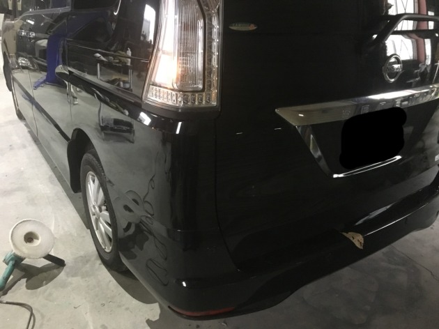 日産セレナ 左側面こすってしまいベッコリ凹んだリアフェンダー修理塗装!