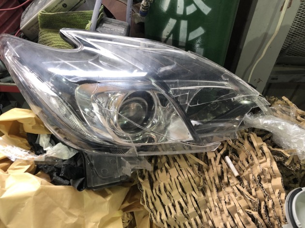 トヨタ50系プリウス用TRD製フロントスポイラーの割れ修理ご依頼をいただきました。 右側部分が割れて、デイライトも外れてしまっている状態です。今回は、部分修理にて承りました。 お車からTRD製フロント