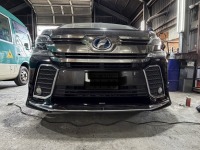 トヨタ ヴェルファイア のご入庫です。 冬の終わり頃にスポイラーが割れてしまい、 オーナー様ご自身で新しいスポイラーを購入されたとのことでしたが、 届いた部品にも割れがあり、 さらにボディカラーとも合