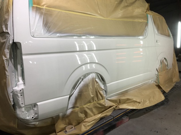 ハイエース200系4型の側面パネル/リア周り板金塗装を終え事故修理完了!