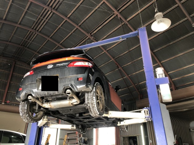 早速リフトに上げて、まずは純正マフラーを取り外します。