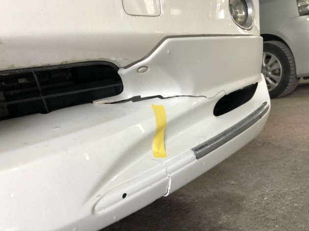 まずは、フロントバンパーの傷付いた箇所を削って整えていきます。