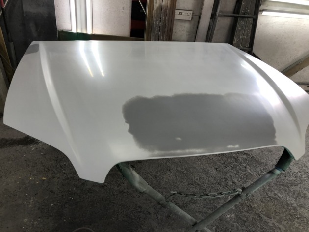 「ボンネットフードの凹み」と「リアフェンダーのガリ傷」を板金して、サフェーサーを塗布します。