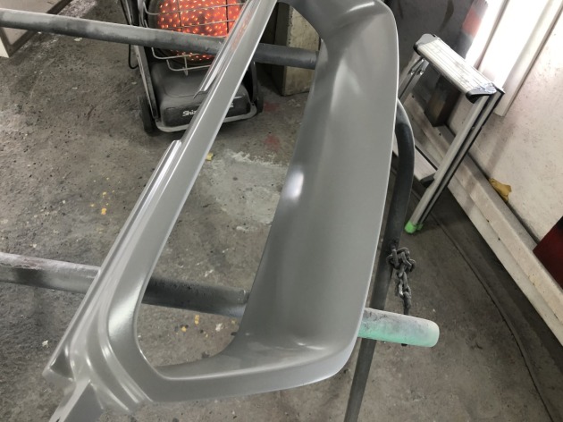 オーナー様がお乗りの車とは異なるボディカラーのエアログリル(フロントグリル)を購入したそうですが、現物を確認すると飛び石キズが酷いので、キズを消そうと、DIYでサフェーサーから缶スプレーまでを塗装した所、なんかゴテゴテになり失敗してしまったようです(o_o)