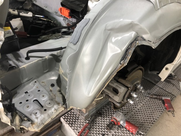 まずは、接触事故により大破したリア廻りを荒出し引き出し作業の後、外板パネル(リアフェンダー)を剥がしていきます。