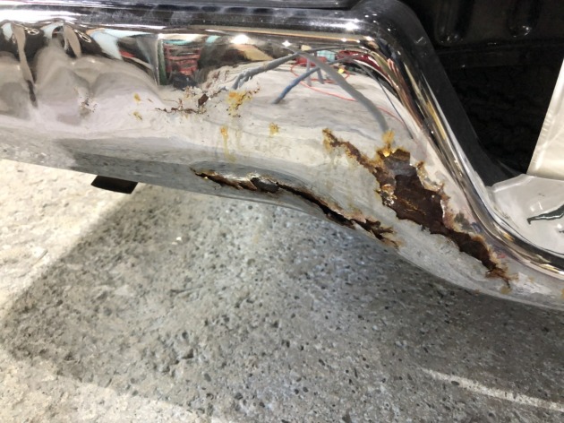 まずは、朽ちてきたメッキバンパーの取り外し作業ですが、、、ガッチガチに固まったボルトをミシミシいわせながらやっと外せたのと・・・折れたのと・・・で、何とか取り外し完了です。